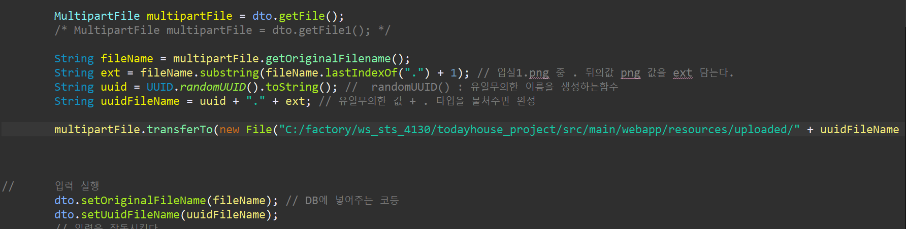 multipartFile.transferTo(new File("C:/factory/ws_sts_4130/todayhouse_project/src/main/webapp/resources/uploaded/" + uuidFileName ));